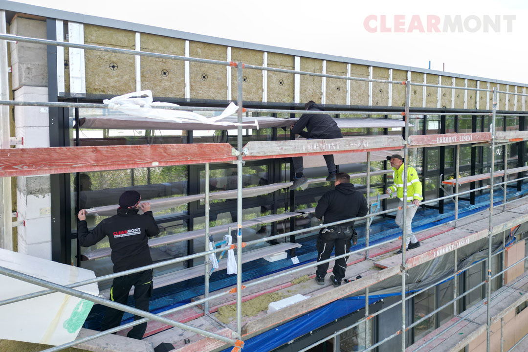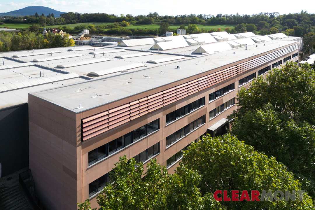 Součástí dodávky prosklené fasádní stěny byl také návrh řešení kotvení stínících hliníkových lamel o šířce 500 mm. Jejich montáž probíhala v závěrečné fázi projektu, těsně před demontáží lešení.