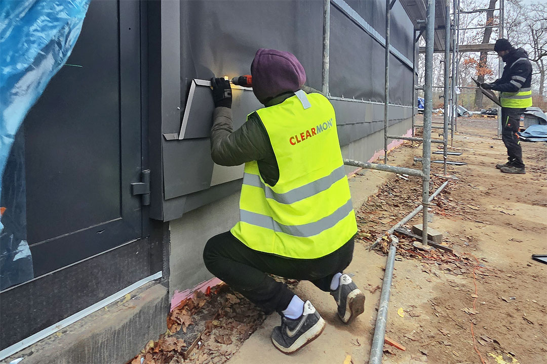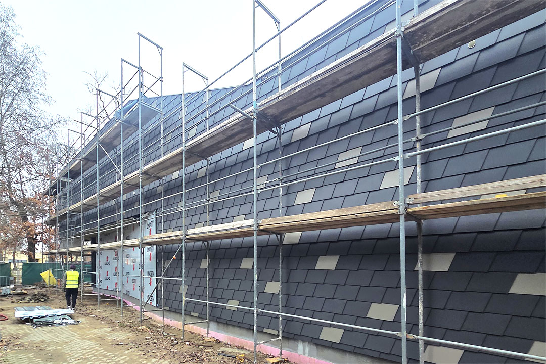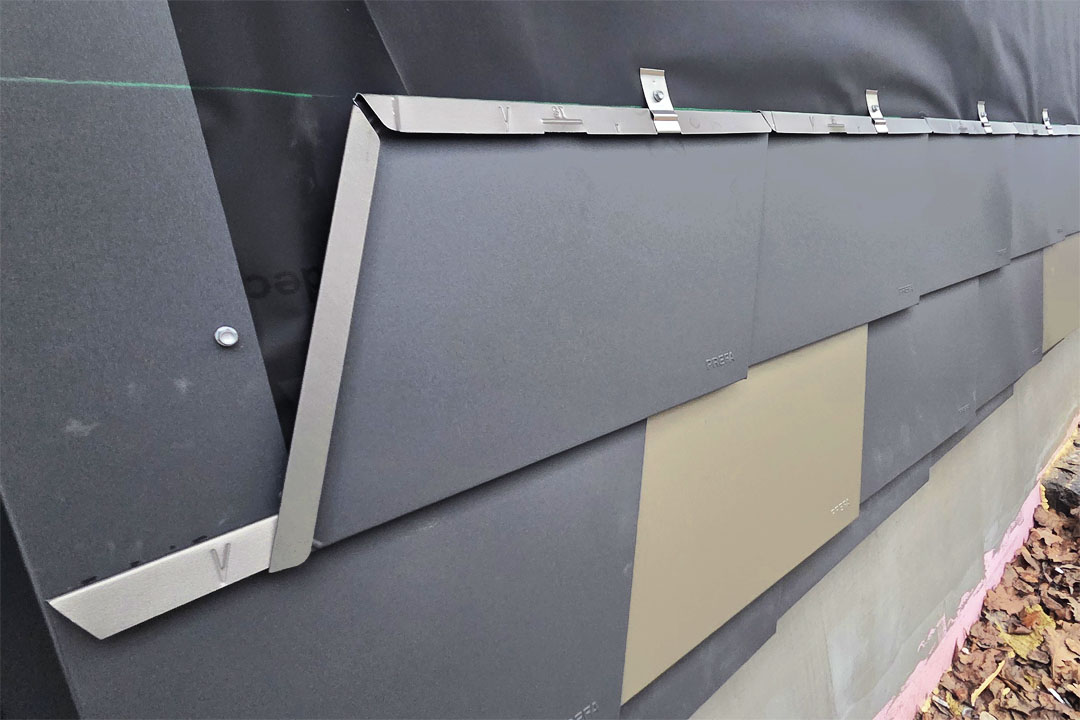 After completing the installation of the supporting grid and thermal insulation, we proceeded to install the PREFA "scales" themselves, which form the final layer of the cladding structure.